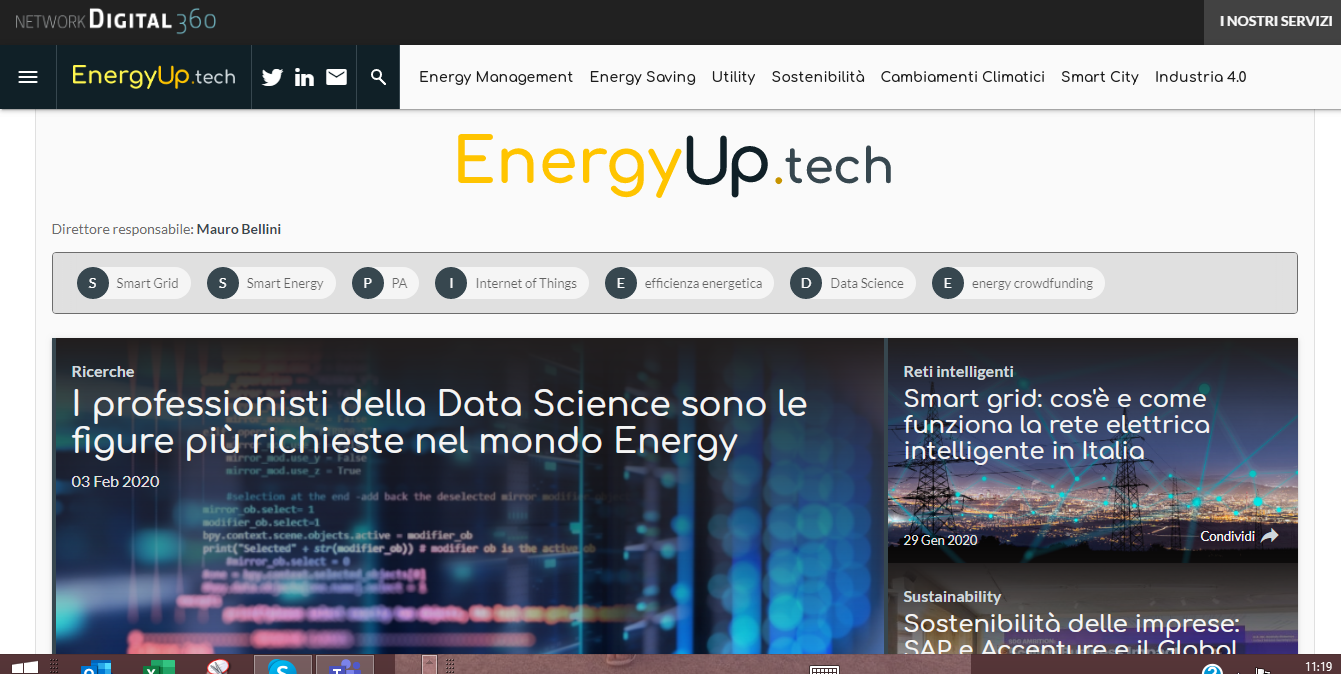EnergyUp.tech è parte dei 55 asset digitali del Network Digital360, tra portali, canali web e newsletter, che rappresentano il più grande network editoriale in Italia specializzato sui temi della trasformazione digitale e dell’innovazione imprenditoriale. Il Network Digital360 ha chiuso il 2019 con una crescita del 32% di visitatori unici rispetto al 2018, una media mensile di 1,6 milioni di lettori e picchi di quasi 2 milioni. Nel 2019 complessivamente le testate del gruppo hanno pubblicato oltre 14.500 articoli sui temi della trasformazione digitale e dell’imprenditorialità hi-tech, superando 50 milioni di pagine viste, con oltre 45.000 keyword posizionate in prima pagina su Google e 247.000 follower sui social network.