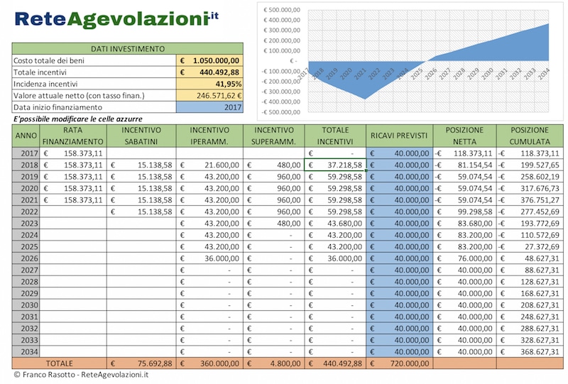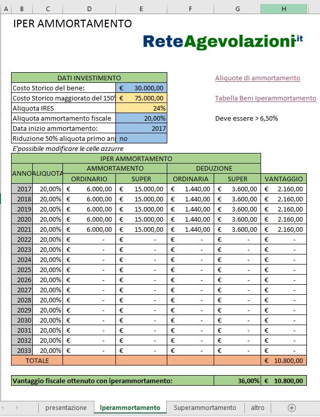 Fare il calcolo della convenienza del super e dell’iper ammortamento non è difficile. Ma c’è chi ha pensato a una soluzione per semplificare anche questo. Si tratta del sito Rete Agevolazioni, che – in cambio della vostra email e dell’iscrizione a una newsletter – vi consente di scaricare gratuitamente un semplice foglio di calcolo Excel creato da Franco Rasotto. Noi lo abbiamo scaricato e provato.