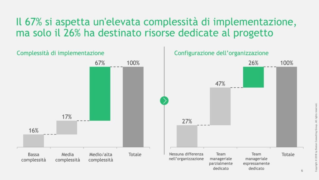 Il 98% delle imprese coinvolte nell’indagine concorda sul fatto che occorra migliorare le competenze per tutti i lavoratori, manager e dirigenti in primis. Anche in questo caso, però, nonostante il 67% si aspetti un’elevata complessità da questo genere di applicazioni, solo il 26% vi ha destinato risorse dedicate attingendo dunque non solo dal comparto IT ma anche dal management più qualificato per dare all’implementazione una visione più ampia.