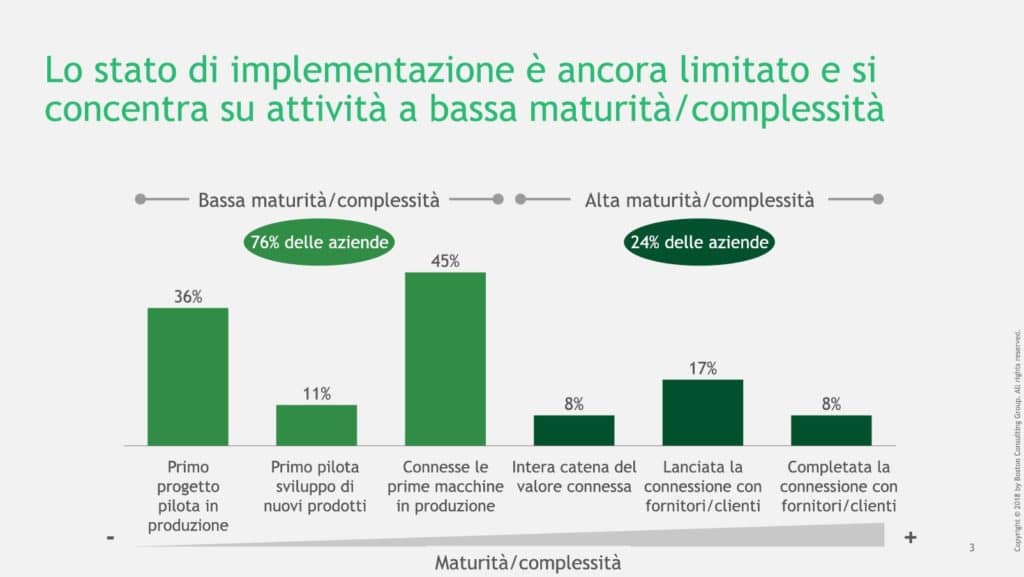 Soltanto il 24% delle aziende ha progetti “ad alta maturità“, che coinvolgono cioè l’intera catena del valore, connessa allo sviluppo di nuovi prodotti con processi che coinvolgano anche fornitori o clienti, denotando – commentano i ricercatori – “contraddizioni e visioni parziali delle opportunità in gioco”.