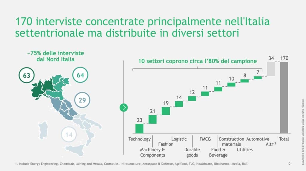 Le aziende italiane individuano nella “capacità di innovare e di innovarsi” ciò che contraddistingue i settori veramente strategici per il paese. Ciononostante il 22% delle aziende italiane del settore manifatturiero non ha ancora attivato né pianificato attività in ambito Industria 4.0 e il restante 78% che lo ha fatto si è concentrata prevalentemente su attività a bassa complessità. Le competenze? Servono, ma sono in pochi ad aver attivato dei team dedicati alla digital transformation. Sono queste alcune delle risultanze che emergono dallo studio “Il futuro della produttività. Diffusione e impatto di Industria 4.0” realizzato congiuntamente da Ipsos e Boston Consulting Group sulla base di una serie di domande rivolte a un campione di 170 aziende appartenenti a oltre 20 diversi settori industriali, con presenze significative da Tecnologia (23%), Macchinari e Componentistica (21%) e Fashion (19%).