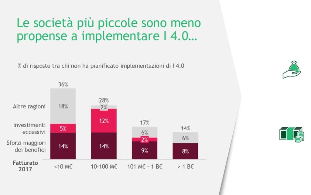 Interessante anche l’analisi dei motivi addotti dalle aziende che non stanno adottando soluzioni 4.0. Le più restie sono le aziende più piccole, ovvero con meno di 10 milioni di euro di fatturato annuo, che costituiscono il 36% di questo campione. Le due principali ragioni di perplessità sono gli investimenti eccessivi richiesti e i benefici non significativi se rapportati allo sforzo che si dovrebbe sostenere per le implementazioni. Oltre, naturalmente, al tema delle competenze, che vedremo tra poco.