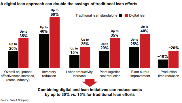 Ma non solo, Lean 4.0 è talmente vantaggioso che porta a un beneficio nelle performance maggiore rispetto a quello che le aziende raggiungerebbero implementando singolarmente i due paradigmi (Buer, Semini, Strandhagen and Sgarboss, 2020). Questo viene anche ben visualizzato dal grafico di Bain & Company, Inc., dove si evince che Lean 4.0 aggiunge on top ai risultati del tradizionale Lean il 100% del miglioramento.