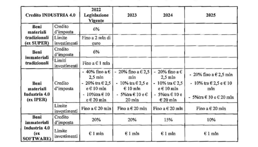 “1057-bis. Alle imprese che effettuano investimenti in beni strumentali nuovi indicati nell’allegato A annesso alla legge 11 dicembre 2016, n. 232, a decorrere dal 1° gennaio 2023 e fino al 31 dicembre 2025, ovvero entro il 30 giugno 2026, a condizione che entro la data del 31 dicembre 2025 il relativo ordine risulti accettato dal venditore e sia avvenuto il pagamento di acconti in misura almeno pari al 20 per cento del costo di acquisizione, il credito d’imposta è riconosciuto nella misura del 20 per cento del costo, per la quota di investimenti fino a 2,5 milioni di euro, nella misura del 10 per cento del costo, per la quota di investimenti superiori a 2,5 milioni di euro e fino a 10 milioni di euro, e nella misura del 5 per cento del costo, per la quota di investimenti superiori a 10 milioni di euro e fino al limite massimo di costi complessivamente ammissibili pari a 20 milioni di euro”.