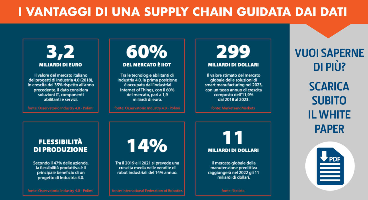 Supply chain 4.0 significa ribaltare tutte le strategie aziendali, incentrate su una gestione storico/statistica delle informazioni, per imparare a gestire meglio i dati a disposizione di tutti gli attori della filiera, mettendoli a fattor comune. Il progresso digitale, infatti, sta offrendo un’occasione unica per finalizzare al meglio il business. La generazione di di informazioni associata alla cordata di tecnologie che rientrano sotto il cappello dell’Industria 4.0 stanno diventando il mantra dell’efficienza, della velocità e della flessibilità per qualsiasi organizzazione.