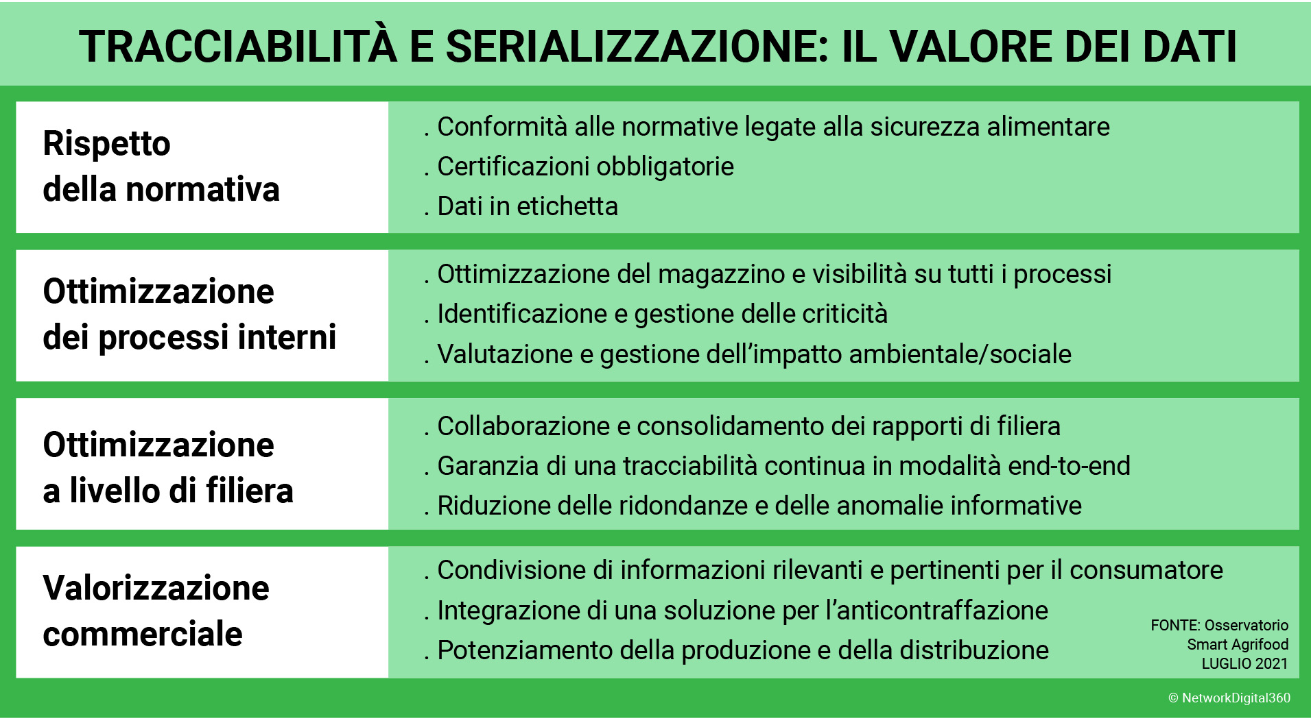 Dal punto di vista della qualità, la storicizzazione delle informazioni associata alla tracciabilità rappresenta un grosso valore aggiunto per la salute dei consumatori. Nel caso di un prodotto o di un lotto compromesso, a livello di filiera è possibile garantire la massima trasparenza informativa dal punto di vista igienico-sanitario per risalire immediatamente al momento in cui qualcosa non è stato gestito in modo corretto e conforme.