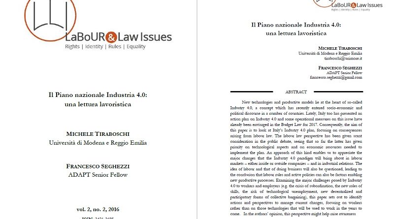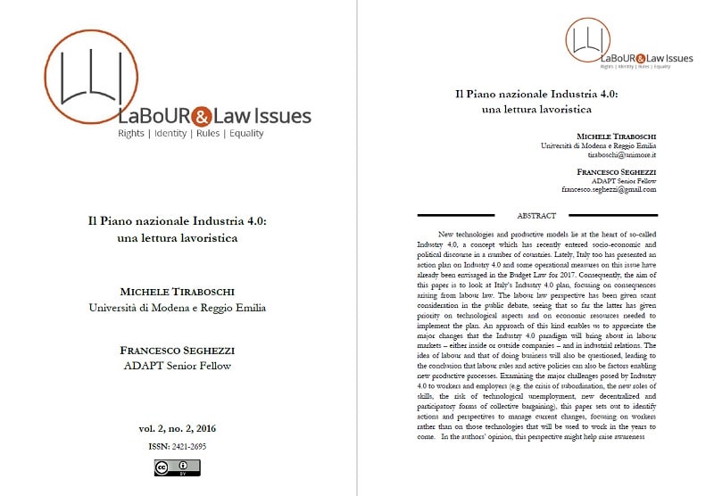 Il professor Michele Tiraboschi dell’Università di Modena e Reggio Emilia e Francesco Seghezzi, Senior Fellow di Adapt, l’associazione fondata da Marco Biagi nel 2000 per promuovere studi e ricerche nell’ambito delle relazioni industriali e di lavoro, hanno pubblicato un lavoro nel quale si analizza in chiave giuslavoristica e di impatto sul sistema italiano di relazioni industriali le complesse sfide aperte da Industria 4.0 e, più in generale, dalla digitalizzazione del lavoro. L’obiettivo dichiarato del lavoro è indicare quali possono essere le leve di azione e gli ambiti di riflessione per governare il cambiamento in atto mettendo al centro la persona che lavora e non la tecnologia con cui si lavorerà in futuro, cioè