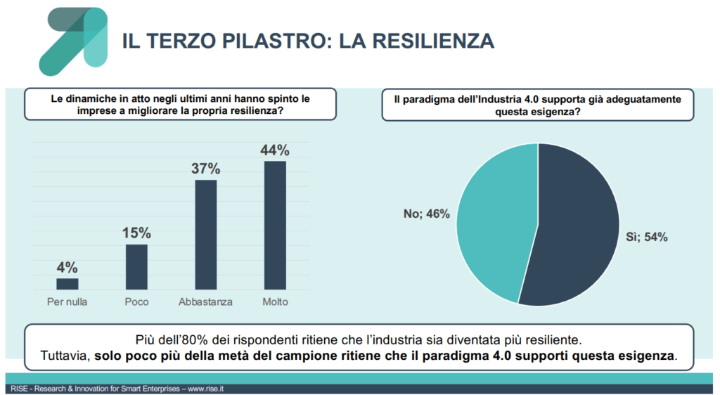 I risultati della survey sul tema Industry 5.0 realizzata da Innovation Post, Industry4Business e Internet4Things, in collaborazione con il Laboratorio RISE dell’Università degli Studi di Brescia. Mentre sostenibilità e human centricity sono rienute esigenze effettive dell’industria che non sono adeguatamente affrontate dai paradigmi di Industria 4.0, il tema della resilienza viene visto come pertinente ma non una novità per l’industria. Per quanto riguarda la relazione tra Industry 4.0 e 5.0, la maggioranza del campione vede la seconda come un’evoluzione della prima, anche se il 43% ritiene sia giusto parlare di nuovo paradigma di riferimento.