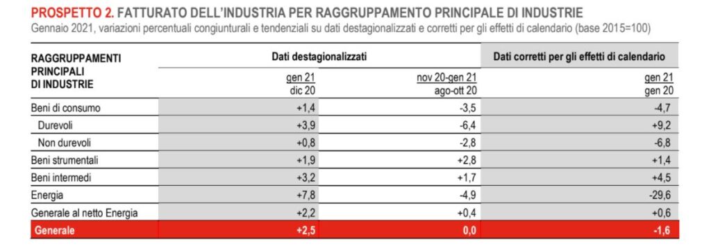 In termini tendenziali (quindi confrontando questi dati con quelli registrati a gennaio 2020), il fatturato totale diminuisce dell’1,6%, con cali dell’1,3% sul mercato interno e del 2,2% su quello estero. Il settore industriale più colpito è stato quello energetico, che ha registrato un calo tendenziale del 29,6%, seguito dai beni di consumo (-4,7%).