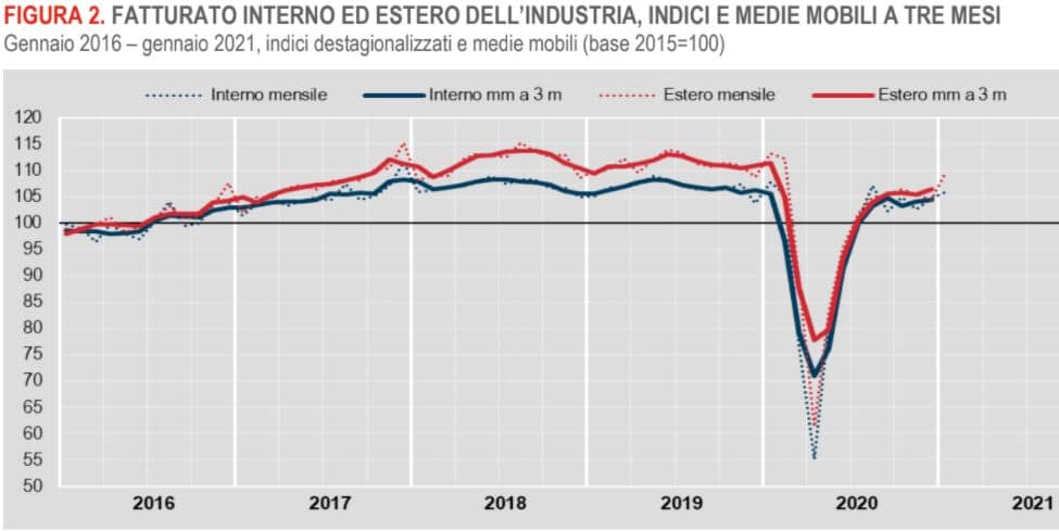 Si è aperto con un segno positivo il 2021 per l’industria italiana: i dati Istat mostrano infatti un aumento di fatturato del 2,5% rispetto a dicembre 2020. Una crescita dovuta soprattutto alla ripresa della domanda estera, che registra un aumento del 5%, a fronte di una ripresa della domanda interna più contenuta (+1,2%).