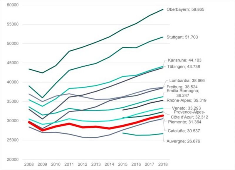 Risorse che sono ancora più cruciali allo sviluppo economico della regione alla luce delle conseguenze della pandemia, che ha infatti ridotto di ulteriori 11 miliardi il PIL regionale, su cui già gravava un differenziale di 31 miliardi rispetto alle regioni europee comparabili.