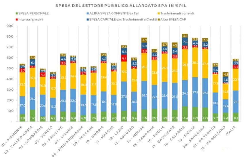 Un divario pro capite di 7,136 euro, che nell’ultimo decennio è stato determinato da 3,9 miliardi annui di minori investimenti pubblici legati all’economia. A fronte di questa riduzione l’investimento si è mantenuto tra il 20 e il 22% del PIL nel decennio, terminando a 21,1%, un valore medio rispetto al campione.