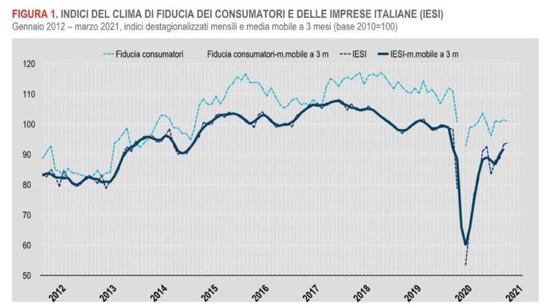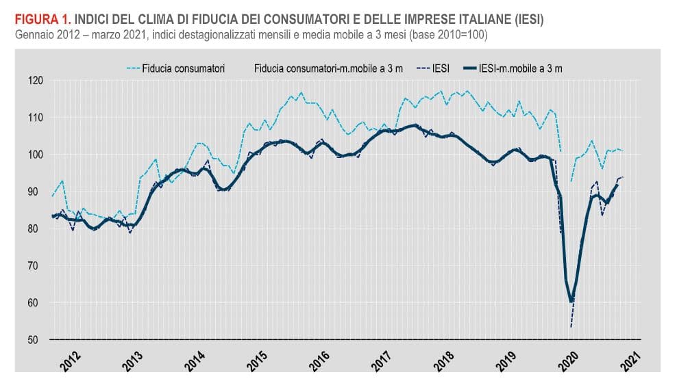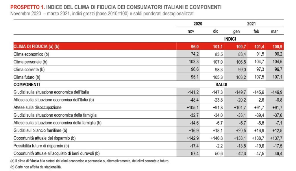 In peggioramento tutte le componenti dell’indice di fiducia dei consumatori, fatta eccezione per le attese relative alla disoccupazione, che rimangono stabili rispetto ai valori di febbraio (+91,7), conseguenza forse del blocco dei licenziamenti prorogato con il decreto sostegni dal Governo Draghi.