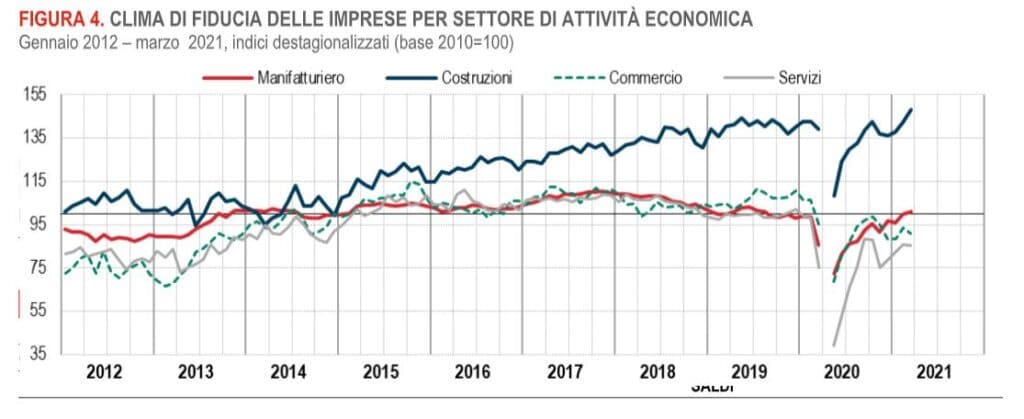 Aumento significativo anche per le costruzioni, dove il clima di fiducia passa da 139,1 a 143,1 e le attese di occupazione salgono a +7,5 rispetto al +2,3 di febbraio.