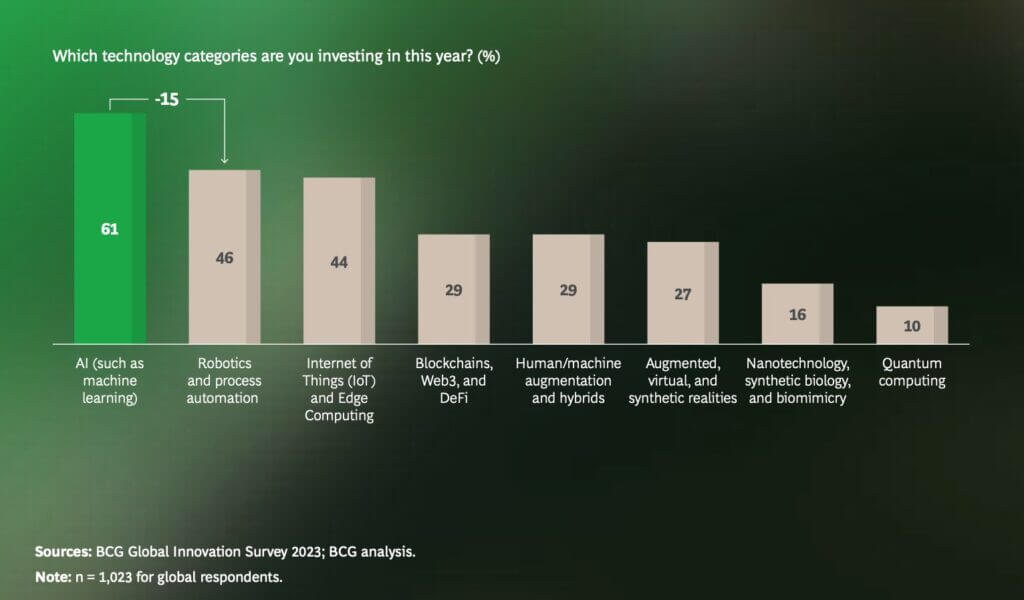L’intelligenza artificiale è considerato lo strumento chiave per ampliare le capacità di innovazione delle aziende, come testimoniano le priorità in termini di investimenti: il 61% delle aziende sta già investendo in AI e apprendimento automatico. Al secondo posto ci sono robotica e automazione dei processi.