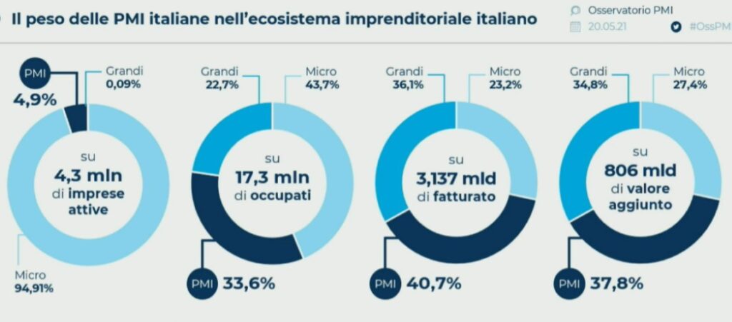 A fronte di un totale di circa 4,4 milioni di imprese attive in Italia, le quasi 220 mila PMI (imprese con un numero di addetti compreso fra 10 e 249, con meno di 50 milioni di euro di fatturato) costituiscono un pilastro del tessuto imprenditoriale italiano, rappresentando il 41% del fatturato nazionale, il 38% del valore aggiunto e il 33% degli occupati.