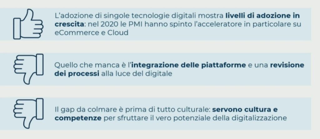 C’è anche da sottolineare che l’adozione di soluzioni digitali di per sé non ha un legame positivo significativo con le performance economiche e con la produttività aziendale: un percorso di trasformazione digitale include non tanto la digitalizzazione di singoli processi, bensì la revisione delle attività aziendali in ottica strategica, con un’attenzione alla componente di cultura e di vision.