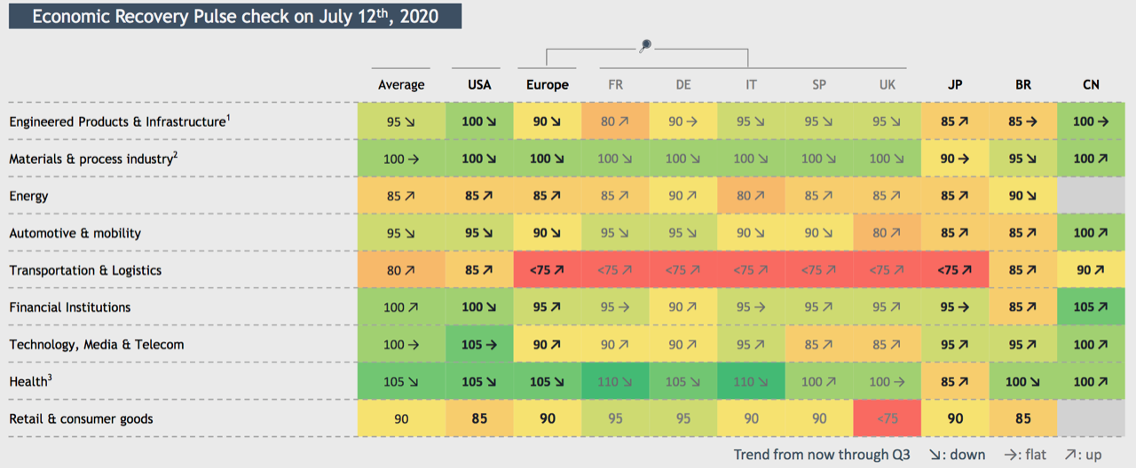 In Europa a pagare le conseguenze del lockdown, è l’industria automobilistica con un -95% sulle vendite, da maggio però mostra segni di ripresa. A recuperare meglio sono Germania e Francia grazie alle vendite nei paesi extra EU e ai recovery plan stilati dai governi. Anche trasporti e logistica hanno avuto pesanti ripercussioni a causa della sospensione delle importazioni e delle esportazioni internazionali, così come l’ambito finanziario. In controtendenza il settore sanitario, la cui crescita è spiegata dalle necessità primarie in piena pandemia. Anche l’attività dei consumatori torna a stabilizzarsi, specialmente in Germania e Francia, mentre in Regno Unito i livelli di consumo sono ancora 24 punti al di sotto della soglia pre-crisi.