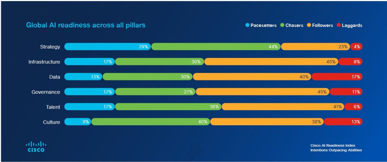 Una innovazione su cui Cisco ha condotto una ricerca dal titolo AI Readiness Index, che ha coinvolto aziende appartenenti a 30 mercati presenti in tutto il mondo. L’indagine ha voluto tracciare lo scenario di un mercato in cui l’adozione dell’AI sta accelerando tanto da produrre una metamorfosi che avrà inevitabilmente impatti decisivi su quasi tutti gli aspetti della vita quotidiana e dell’attività delle imprese.