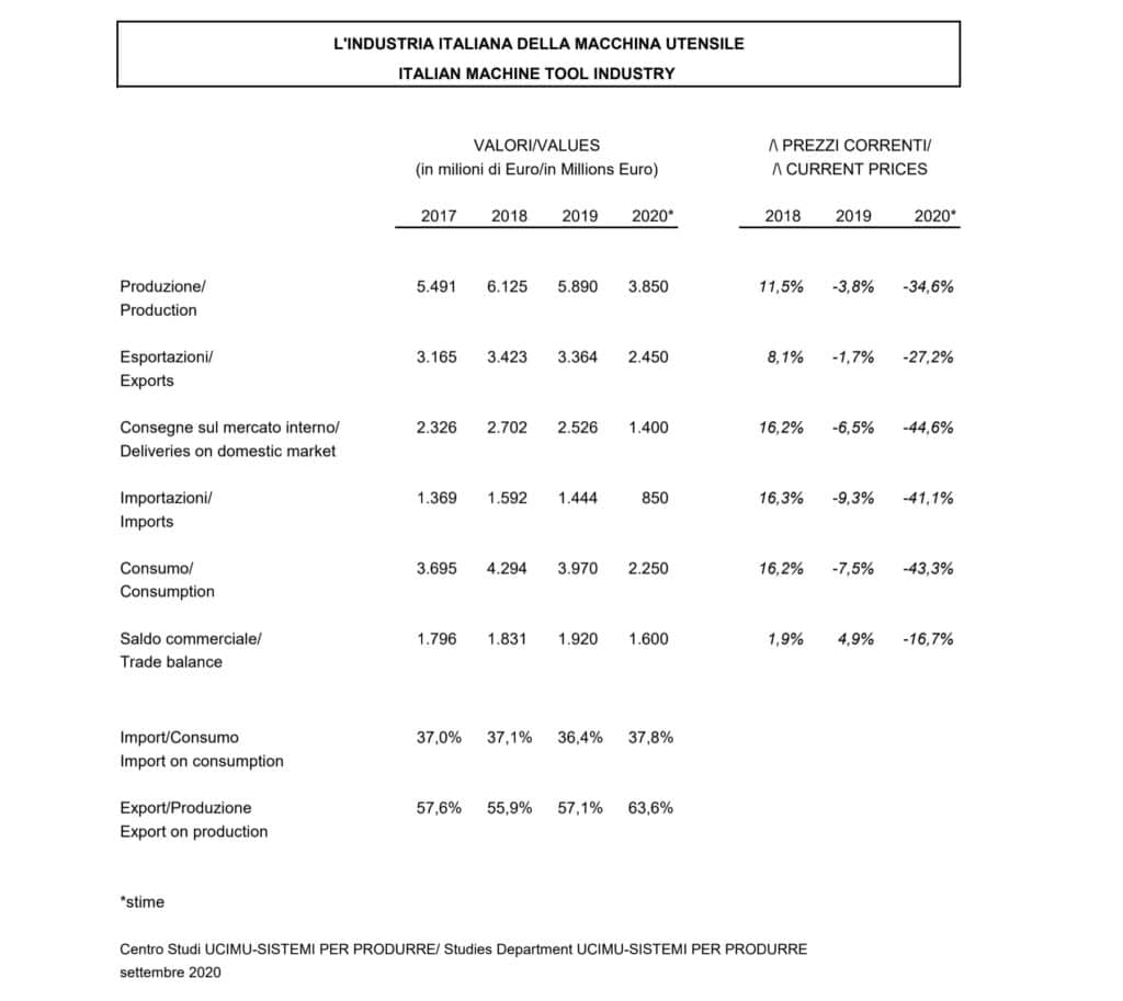 Il 2020 della macchina utensile si chiuderà con un forte passivo. Secondo le previsioni rese note dal centro studi di Ucimu – Sistemi per produrre, dopo il leggero calo registrato nel 2019 (-3,8%), l’anno in corso chiuderà con un vero e proprio crollo. La produzione scenderà del 34,6% a causa del forte calo sia del mercato estero (-27,2% per l’export) sia delle consegne dei costruttori sul mercato interno (-43,3%). Anche le importazioni sono in forte calo (-41,1%), tanto che complessivamente il consumo dell’Italia risulterà in calo del 44,6%.