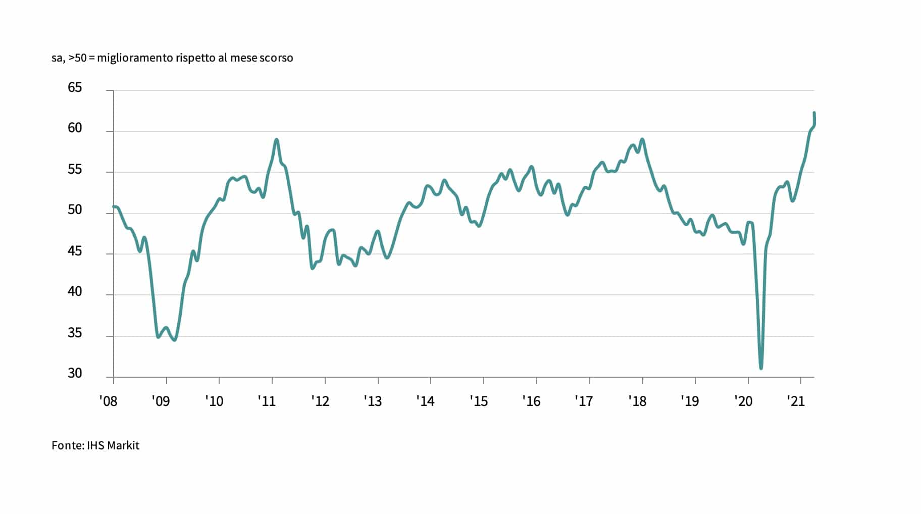 Il settore manifatturiero in Italia è in piena ripresa. Grazie all’aumento record dei nuovi ordini e dei livelli occupazionali e all’ulteriore espansione della domanda a metà del secondo trimestre, il Purchasing Managers’ Index elaborato da IHS Markit tocca quota 62.3 puntisegnando il record assoluto dal 1997, anno in cui è stato creato l’indice PMI.