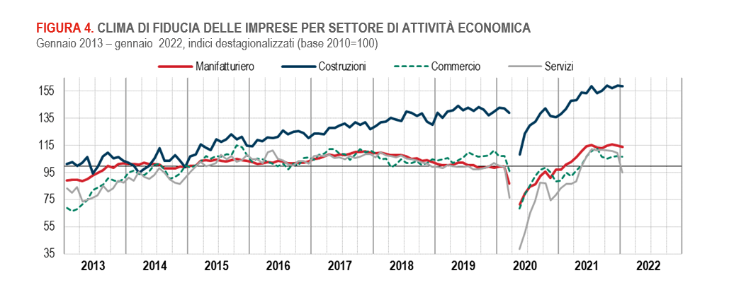 Per quanto riguarda la fiducia delle imprese, a gennaio si registra un deciso calo, con l’indice che passa da112,7 a 105,4. Il valore più basso tra quelli registrati negli ultimi nove mesi, trainato soprattutto dal comparto dei servizi di mercato, dove l’indice passa da 109,6 a 94,9.