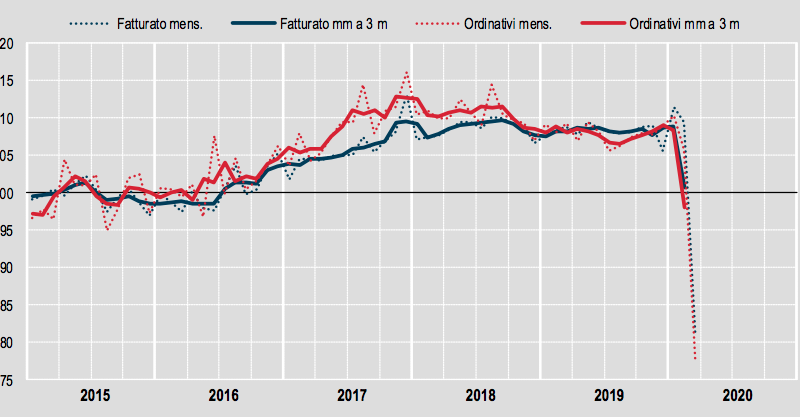 Se si confronta il fatturato di marzo 2020 con quello di marzo 2019, il calo è del 25,2%, mentre per quanto riguarda gli ordinativi, la diminuzione è del 26,6% (-29,3% sul mercato interno e -23,1% su quello estero).
