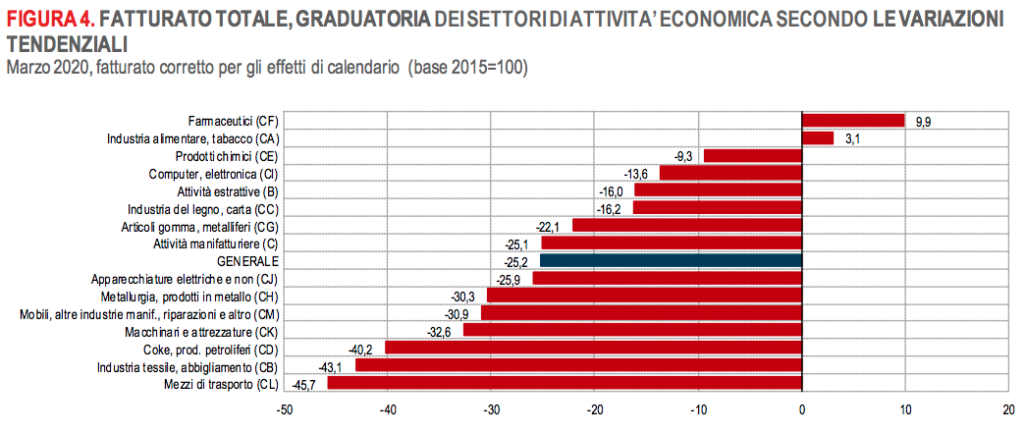 Nel mese di marzo l’industria cede il 25,8% di fatturato. In particolare, ad essere maggiormente colpito è il raggruppamento dei beni strumentali (-36,2%), seguito dall’energia (-32%). Più contenuto (ma sempre superiore al 20%), il calo di fatturato nei settori dei beni intermedi (-20,1%) e dei beni di consumo (-20,8%).