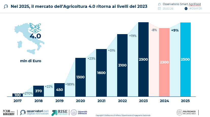 Dopo la flessione registrata nel 2024 (-8%) torna a crescere il mercato italiano dell’Agricoltura 4.0 che nel 2025 raggiunge un valore complessivo di 2,5 miliardi di euro, in aumento del 9% rispetto all’anno precedente, riallineandosi ai livelli record del 2023.