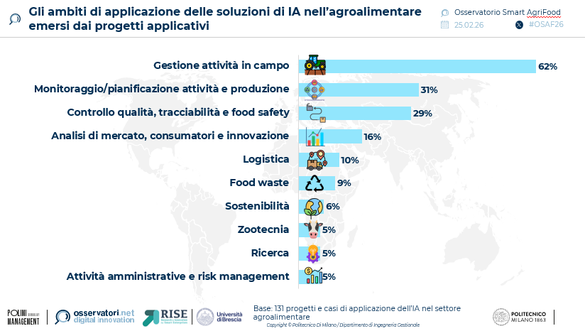 Le applicazioni prevalenti riguardano la gestione delle attività in campo aperto, presente nel 62% delle iniziative mondiali, con soluzioni dedicate al monitoraggio delle colture, all’irrigazione ottimizzata e alla difesa fitosanitaria. Ulteriori ambiti di intervento includono l’efficientamento dei processi produttivi (31%) e il controllo della qualità lungo la filiera (29%).