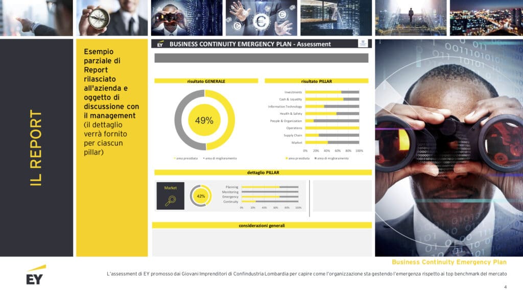 Il tutto tramite uno strumento gratuito di self-assessment per il monitoraggio della business continuity nei suoi molteplici aspetti operativi e finanziari. Cento domande in tutto per indagare sulle principali aree aziendali (strategia e approccio al mercato, supply chain, operations, people e organizzazione, salute e sicurezza, IT, cash e liquidità e investimenti).
