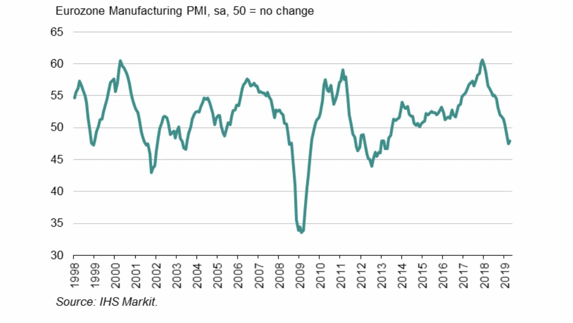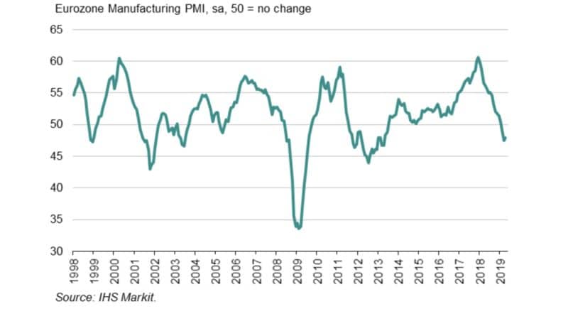 Nel mese di aprile il settore manifatturiero dell’Eurozona ha fatto segnare una significativa contrazione. Il Purchasing Managers Index (PMI) del Manifatturiero, l’indice composito dell’attività manifatturiera elaborato da Markit Group che riflette la capacità di un’area economica di acquistare beni e servizi tenendo conto di nuovi ordini, produzione, occupazione, consegne e scorte nel settore manifatturiero, ha registrato il valore di 47,9.
