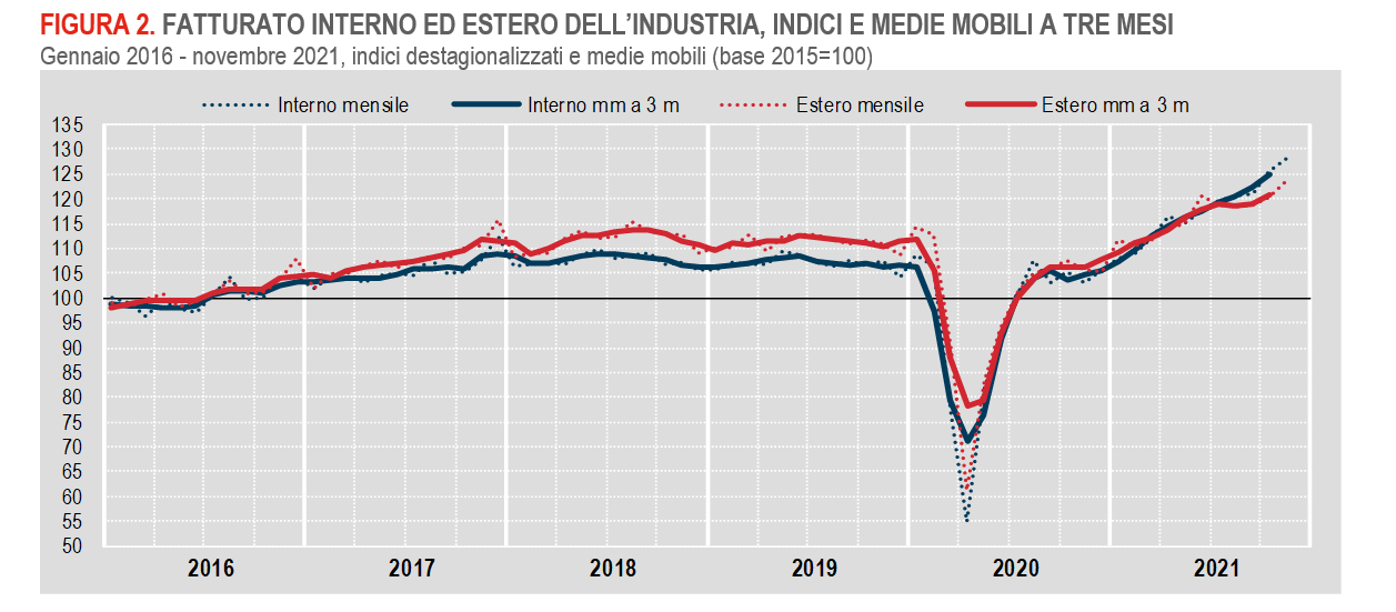 Dal confronto con il mese di novembre 2020, il fatturato totale cresce in termini tendenziali del 22,2%, registrando un aumento del 24,7% sul mercato interno e del 17,3% su quello estero.