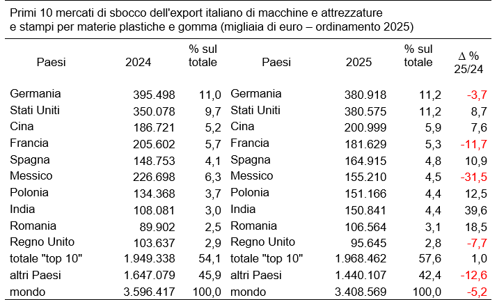 Il dato riflette la crisi della filiera tedesca della gomma-plastica, che ha archiviato il 2025 con indicatori negativi su tutti i fronti, dalla produzione di polimeri al fatturato dei costruttori. Una dinamica simile ha interessato la Francia, dove le forniture sono diminuite dell’11,7%, fermandosi a 181,6 milioni di euro.