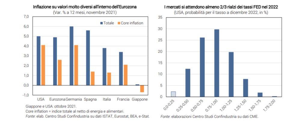 La decisione FED, a novembre-dicembre, di ridurre rapidamente gli acquisti di titoli, fa presagire un aumento dei tassi ufficiali USA nel 2022. Invece, la BCE si mantiene su una policy molto espansiva, avendo deciso a dicembre solo piccoli aggiustamenti del sentiero degli acquisti. Una buona notizia per l’Italia, Paese ad alto debito: il BTP resta basso e stabile (0,91% a dicembre).