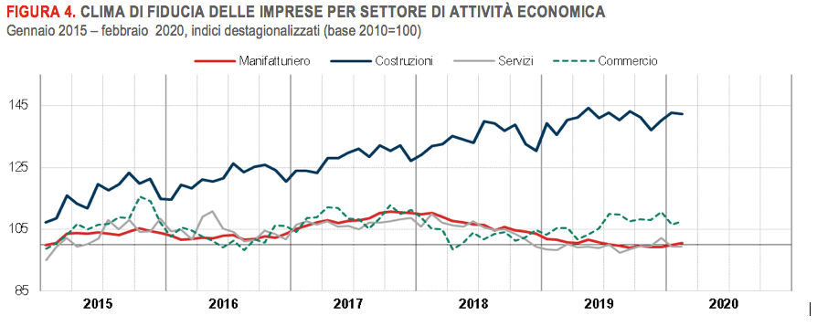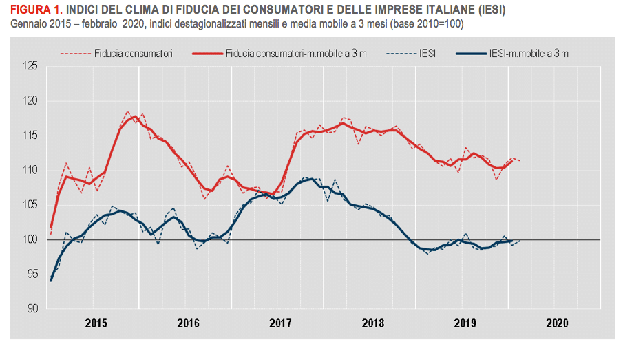 Sale da 99,2 a 99,8 (con un incremento pari a 0,6 punti) l’indice del clima di fiducia delle imprese. Nei dati diffusi dall’Istat relativi al mese di febbraio 2020, si segnala in particolare la crescita dell’indice di fiducia nel settore manifatturiero (salito da 100 a 100,6), così come quello del commercio al dettaglio (da 106,6 a 107,6), mentre il dato dei servizi rimane stabile (a 99,4) e quello delle costruzioni è in calo (da 142,7 a 142,3).
