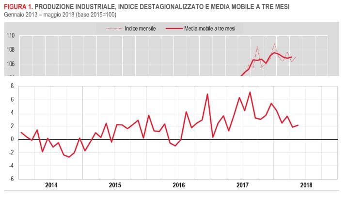 Dai dati relativi a maggio 2018 si stima che l’indice destagionalizzato della produzione industriale sia in crescita dello 0,7% rispetto ad aprile, mentre nella media del trimestre marzo-maggio la produzione è diminuita dello 0,4% sul trimestre precedente. Nello specifico, l’indice destagionalizzato mensile mostra una crescita congiunturale in tutti i comparti: energia (+1,2%), beni intermedi (+0,9%), beni strumentali (+0,4%) e beni di consumo (+0,2%). A maggio 2018 inoltre, con calendario favorevole, l’indice è aumentato in termini tendenziali del 2,1% (i giorni lavorativi sono stati 22 come a maggio 2017). Nella media dei primi cinque mesi la produzione è cresciuta del 2,8% su base annua.