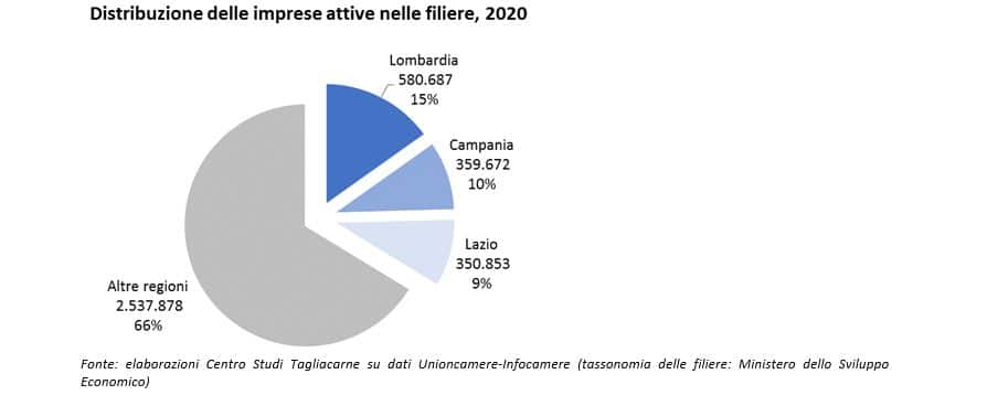 Per quanto riguarda la distribuzione geografica di queste imprese, è la Lombardia – con oltre 580mila imprese attive (15% del totale nazionale) – a svettare in cima alla classifica italiana delle imprese che operano in filiera.