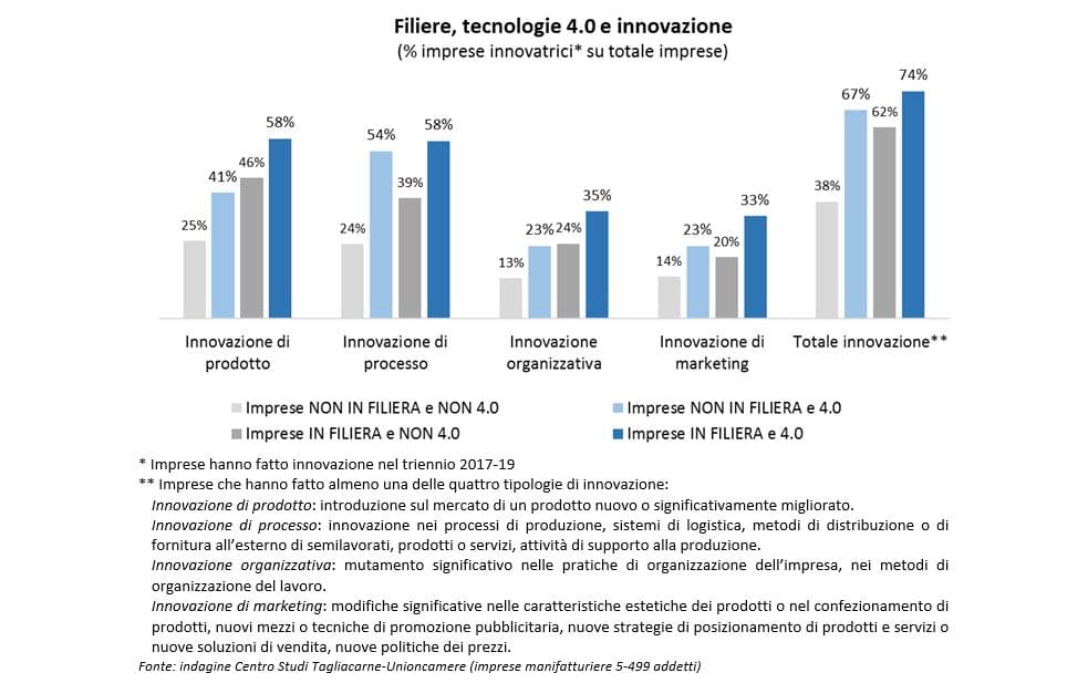 Anche tra le imprese che adottano tecnologie 4.0 pesa l’effetto filiera: il 74% delle imprese che collaborano tra loro ha investito in almeno una forma di innovazione (tra quelle di prodotto, processo, organizzativa, marketing), contro il 67% di quelle non filiera.