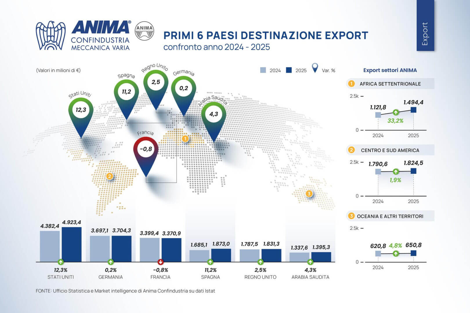 “La crescita del 2025 riflette una redistribuzione geografica della domanda, con concentrazione su pochi mercati chiave e indebolimento di altri”, afferma Pietro Almici, presidente Anima Confindustria.