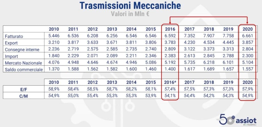 Ad aver sofferto meno sono le esportazioni, che registrano -11,2% nel mercato del Fluid Power e -13,2% in quello del Mechanical Power Transmission, che portano comunque ad un miglioramento della penetrazione dei mercati esteri, con una percentuale di export pari al 60,8%.