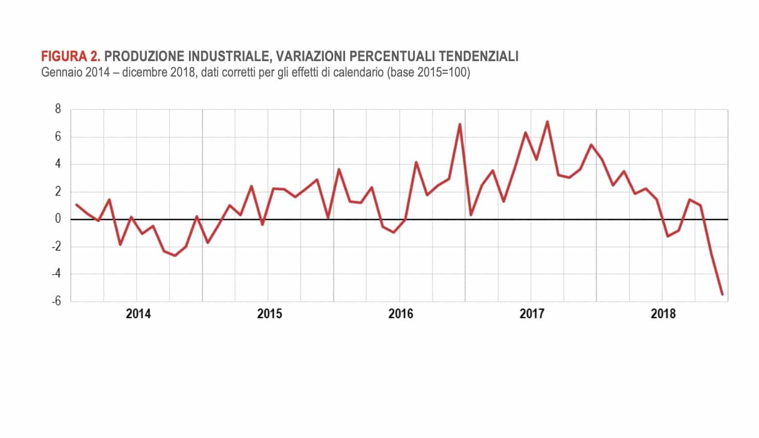 Corretto per gli effetti di calendario (c’è stato un giorno lavorativo in più rispetto al 2017), infatti, l’indice elaborato dall’Istat è diminuito in termini tendenziali (anno su anno) del 5,5%, mentre il calo rispetto a novembre è dello dello 0,8%.