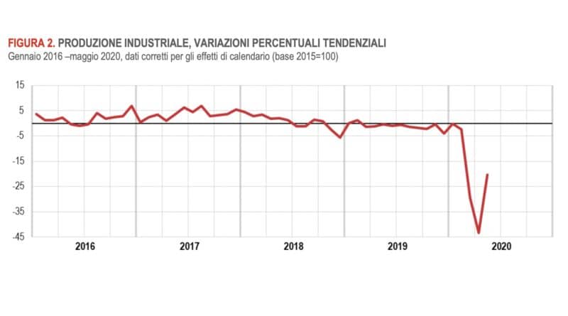 A maggio 2020 si stima che l’indice destagionalizzato della produzione industriale aumenti del 42,1% rispetto ad aprile. Un dato che naturalmente non compensa ancora il crollo di marzo e aprile. Nella media del periodo marzo-maggio infatti il livello della produzione cala del 29,9% rispetto ai tre mesi precedenti.