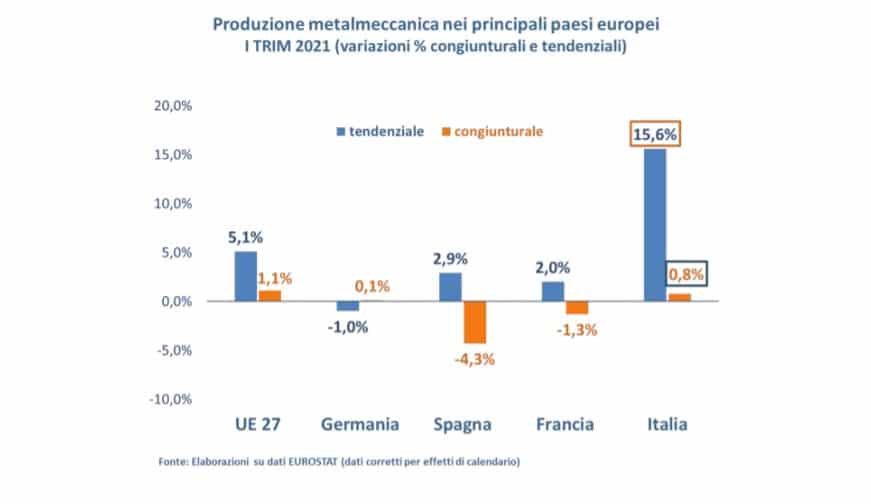 Con riferimento al primo trimestre del 2021, in Italia la produzione metalmeccanica è cresciuta dello 0,8% rispetto agli ultimi tre mesi del 2020, meglio dello 0,1% registrato in Germania, del -1,3% in Francia e del -4,3% in Spagna. Nel confronto tendenziale, l’incremento segnato dal nostro paese (+15,6%) è di gran lunga superiore al recupero osservato in Francia e Spagna, rispettivamente +2,0% e +2,9%, e si contrappone al calo dell’1,0% registrato invece in Germania.
