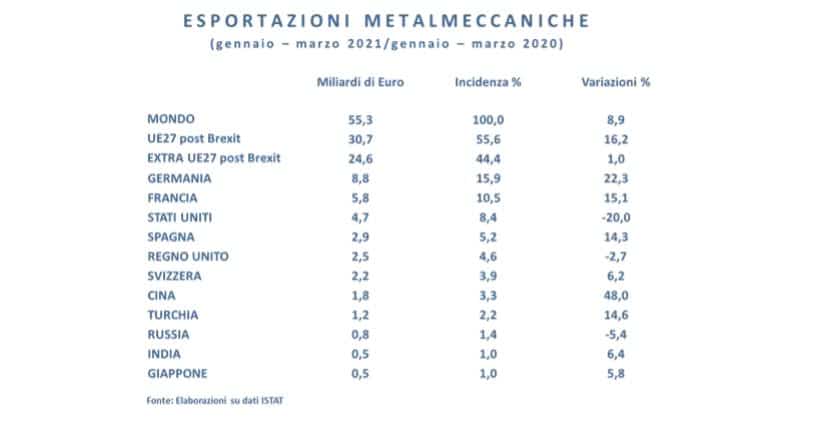 Rispetto al resto dell’economia, si registra una dinamica più positiva per la metalmeccanica, dove le esportazioni sono cresciute dell’8,9%, grazie principalmente al significativo incremento (+16,2%) dei flussi diretti verso i Paesi dell’Unione Europea, dove le importazioni di prodotti metalmeccanici sono mediamente cresciute del 15,1% segnando un +14,2% per i flussi provenienti dai 27 Paesi dell’UE.