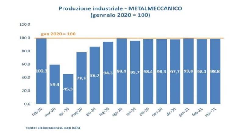 I dati a disposizione forniscono in cambio una fotografia ben diversa: : nel solo mese di marzo, i volumi di produzione metalmeccanica in Italia sono stati pari al 98,8% rispetto a quelli pre-Covid (gennaio 2020), mentre in Germania si sono attestati al 93,2% e in Francia e Spagna, rispettivamente, al 92,1% e all’89,9%.