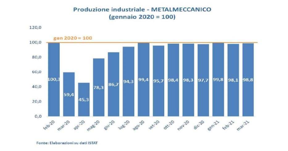 Dopo il crollo del 13,5% registrato nel 2020, la produzione metalmeccanica ha evidenziato un progressivo miglioramento che, iniziato a partire dai mesi estivi, è proseguito anche nei primi mesi dell’anno in corso.