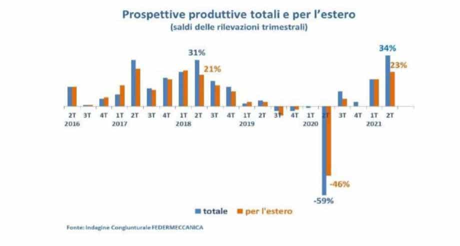 È  un quadro economico in significativo miglioramento quello descritto dalla 158° indagine congiunturale di Federmeccanica: nel primo trimestre del 2021, infatti, la produzione metalmeccanica in Italia è aumentata del 15,6% rispetto all’analogo periodo del 2020. Migliorano anche i giudizi delle imprese sugli ordini (con un saldo positivo del +24%) e le prospettive per l’ccoupazione, con il 16% delle imprese che programma assunzioni per i prossimi mesi.