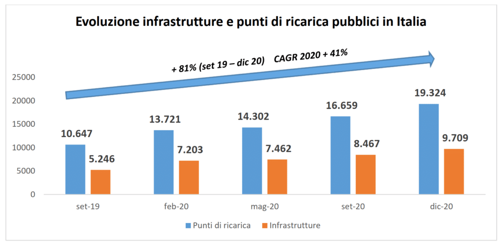 A livello nazionale si contano 19.300 singoli punti di ricarica sparsi in un totale di 9.700 infrastrutture di ricarica accessibili al pubblico. In un anno, le infrastrutture di ricarica (o colonnina o stazione di ricarica) sono passate da 7.200 a 9.700 (+2.500), mentre i punti di ricarica da 13.700 a 19.300 (+5.600). La loro ripartizione è dell’80% su suolo pubblico e del 20% su suolo privato a uso pubblico, per esempio supermercati o centri commerciali, con un mix tra punti di ricarica che è del 96% in corrente alternata e del 4% in corrente continua.