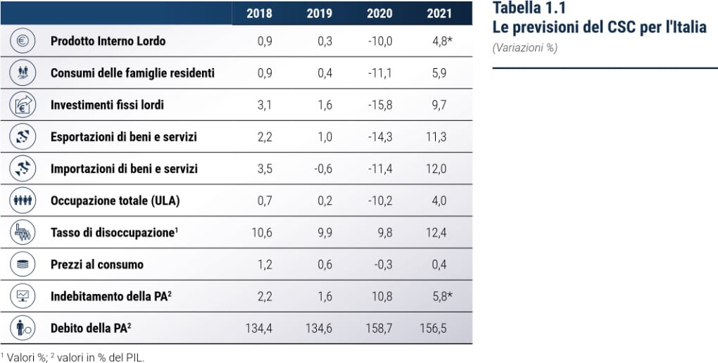 Tuttavia le previsioni di una crescita del 4,8% per il 2021 non tengono ancora conto della manovra (e dei livelli di indebitamento) delineati dal Governo nella NaDEF per il 2021. Includendola, in base alle stime del Governo, il PIL potrebbe salire al 5,7%.